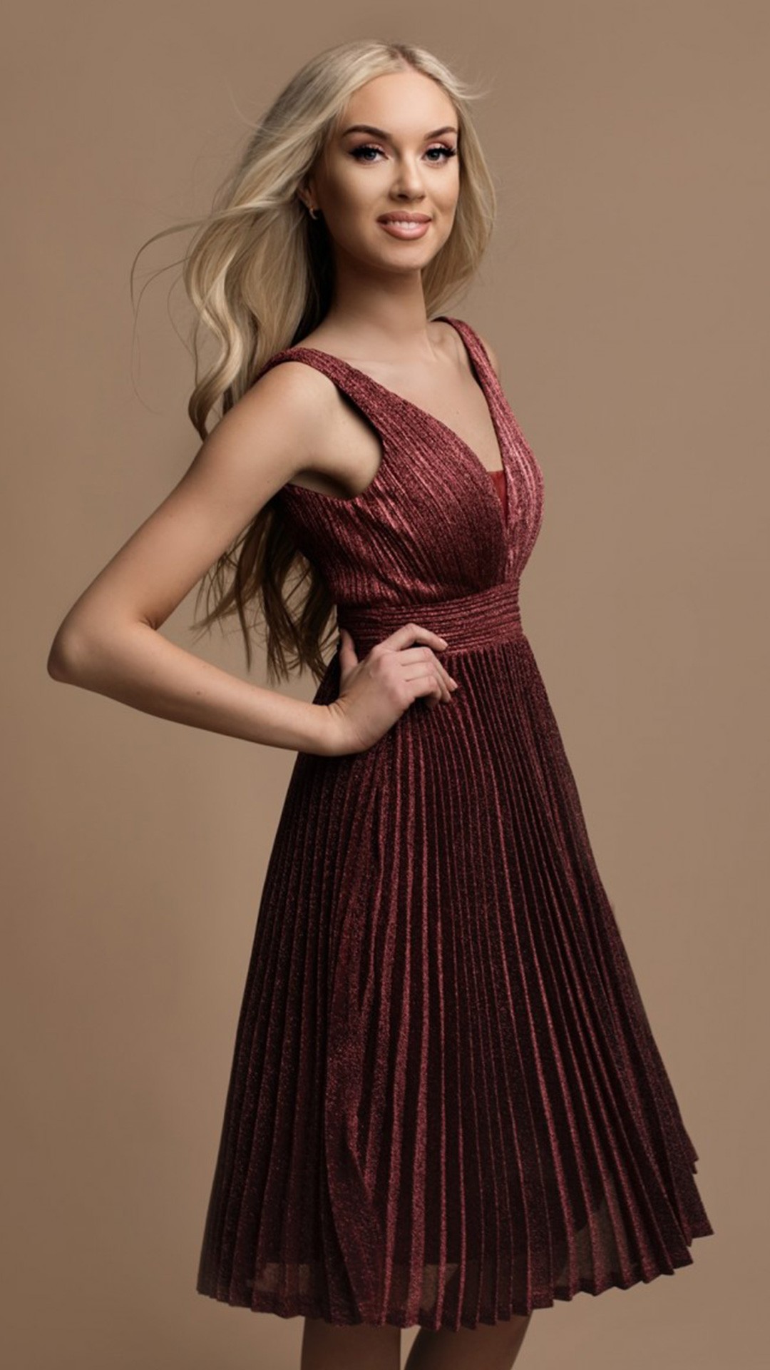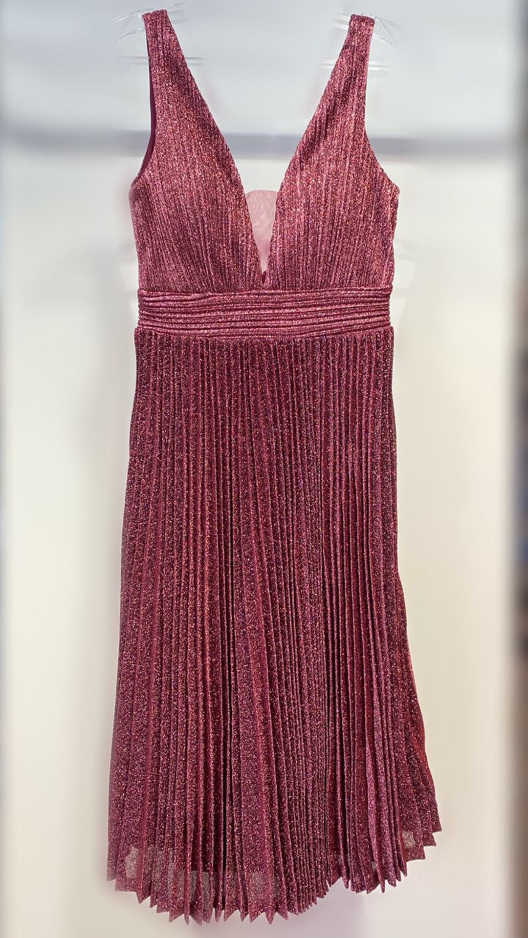 VESTIDO CORTO PLIZADO, TELA DE BRILLO
