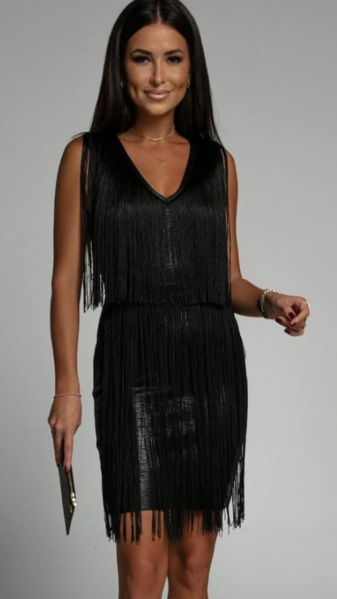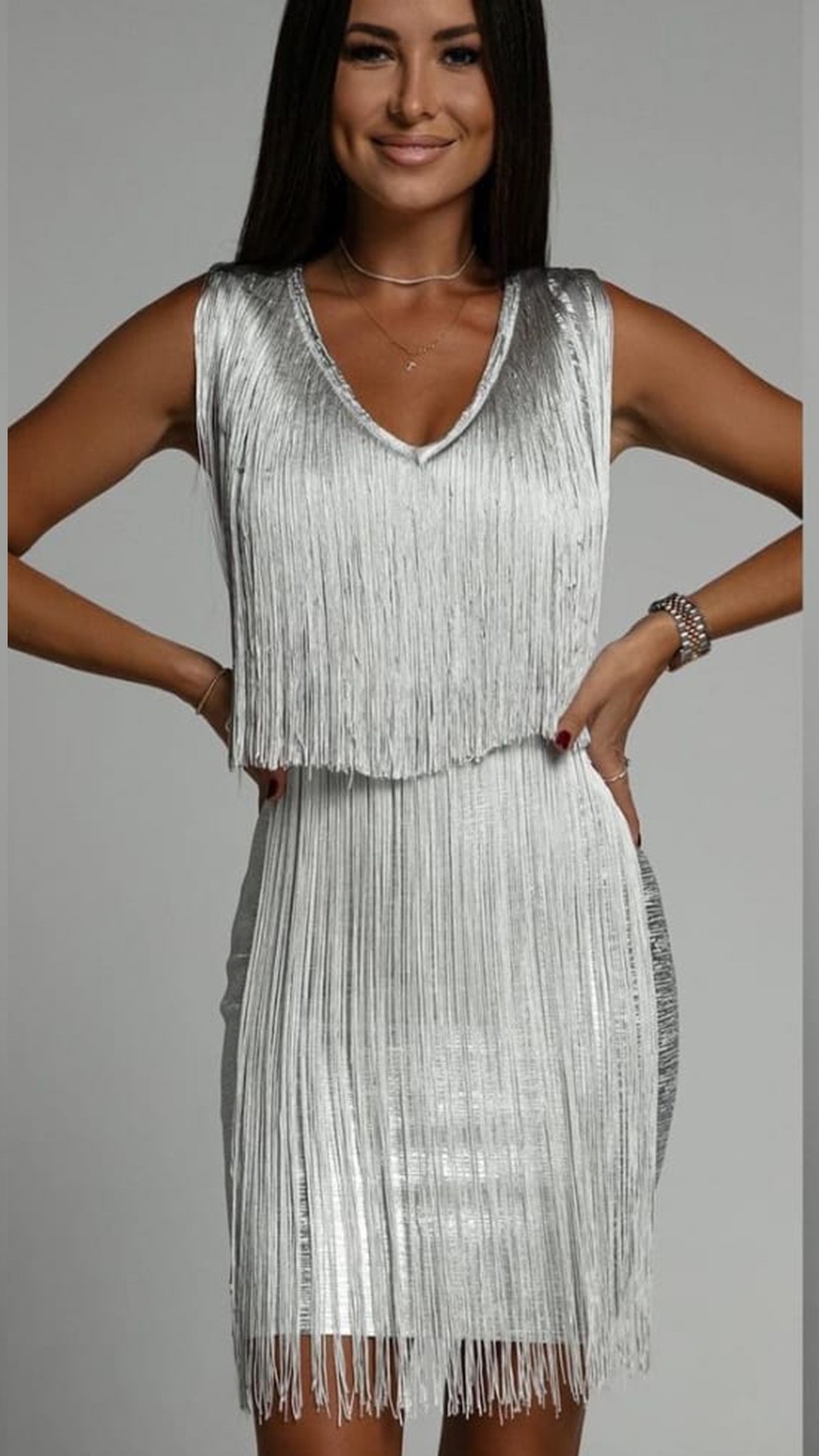 VESTIDO BANDAGE METALIZADO CON FLECOS.