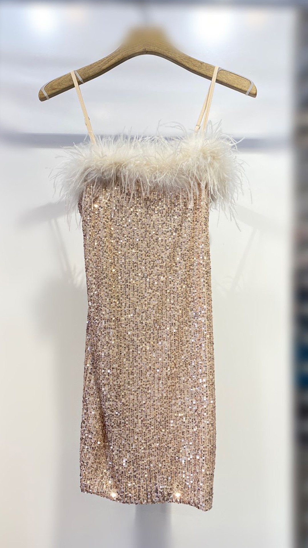 VESTIDO CORTO DE LENTEJUELAS, CON PLUMAS.