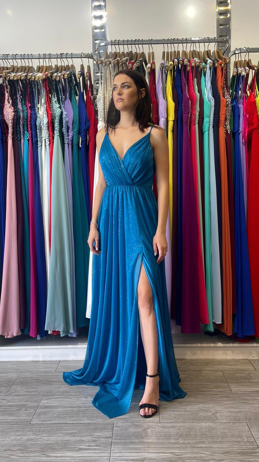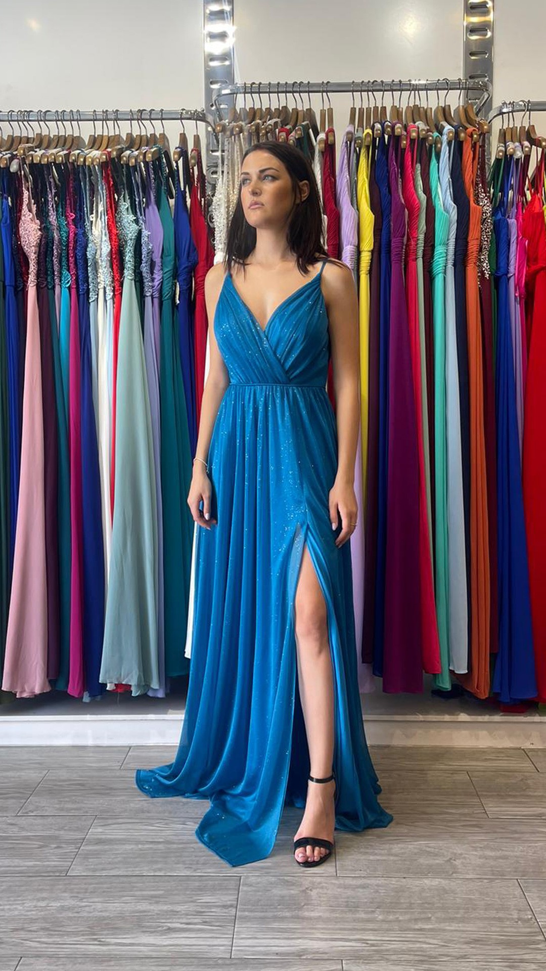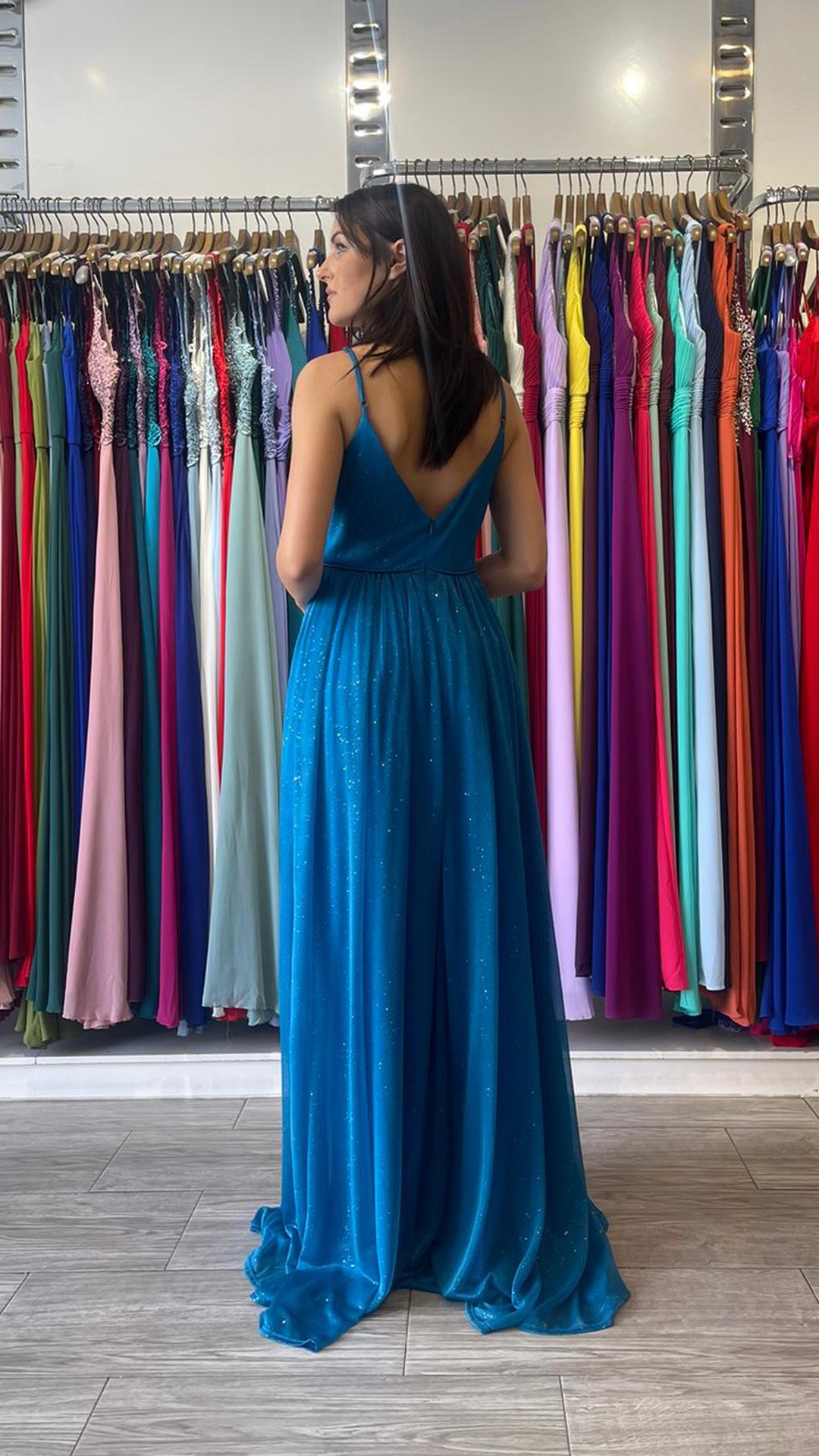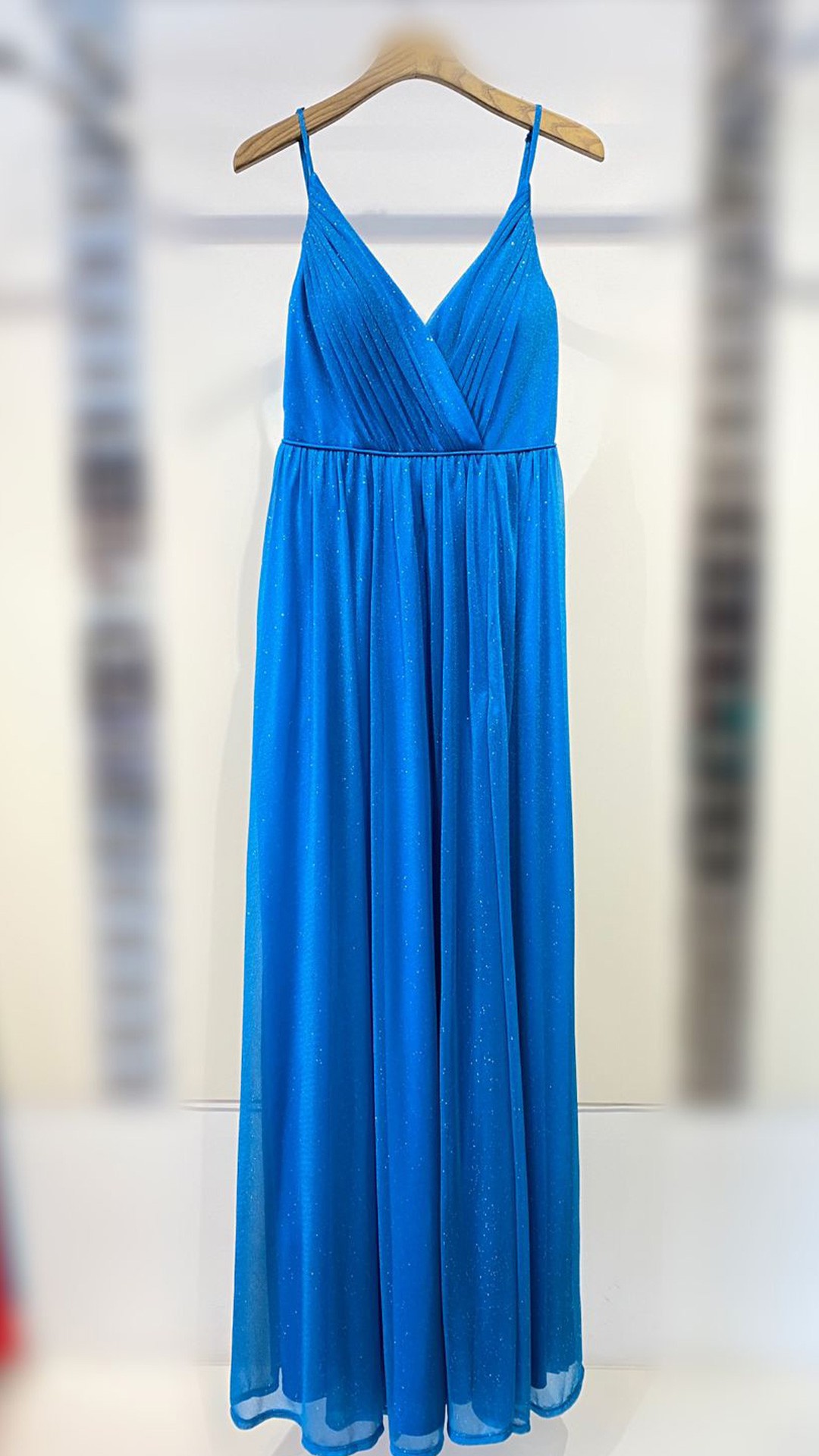 VESTIDO DE TELA DE BRILLOS , CON ABERTURA.