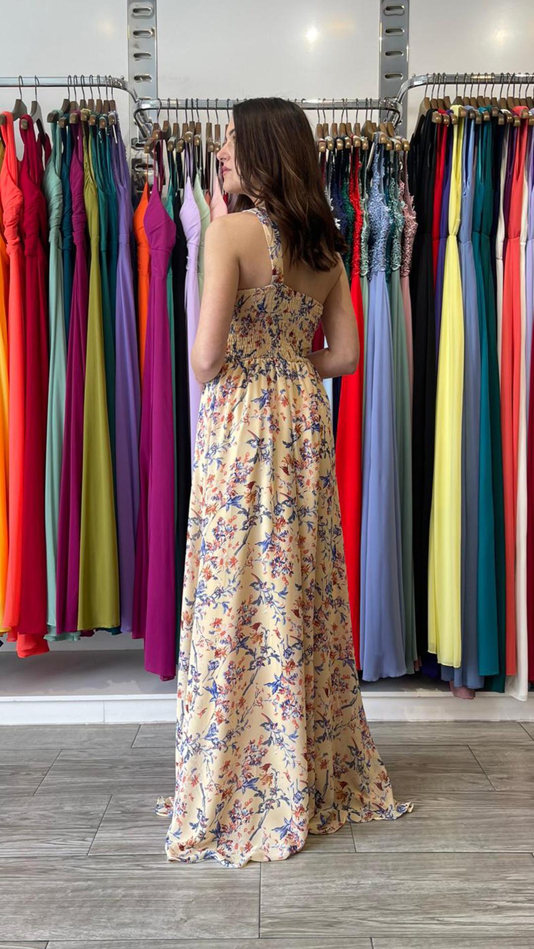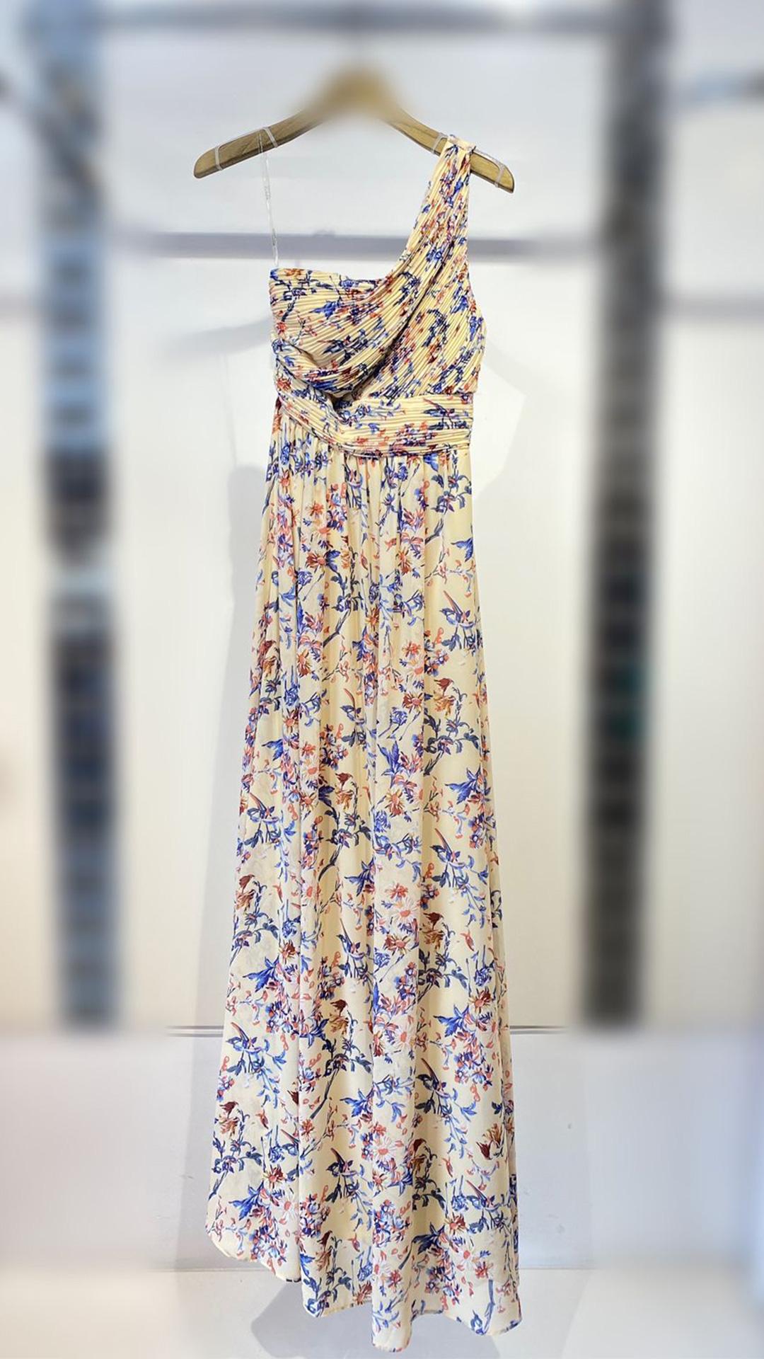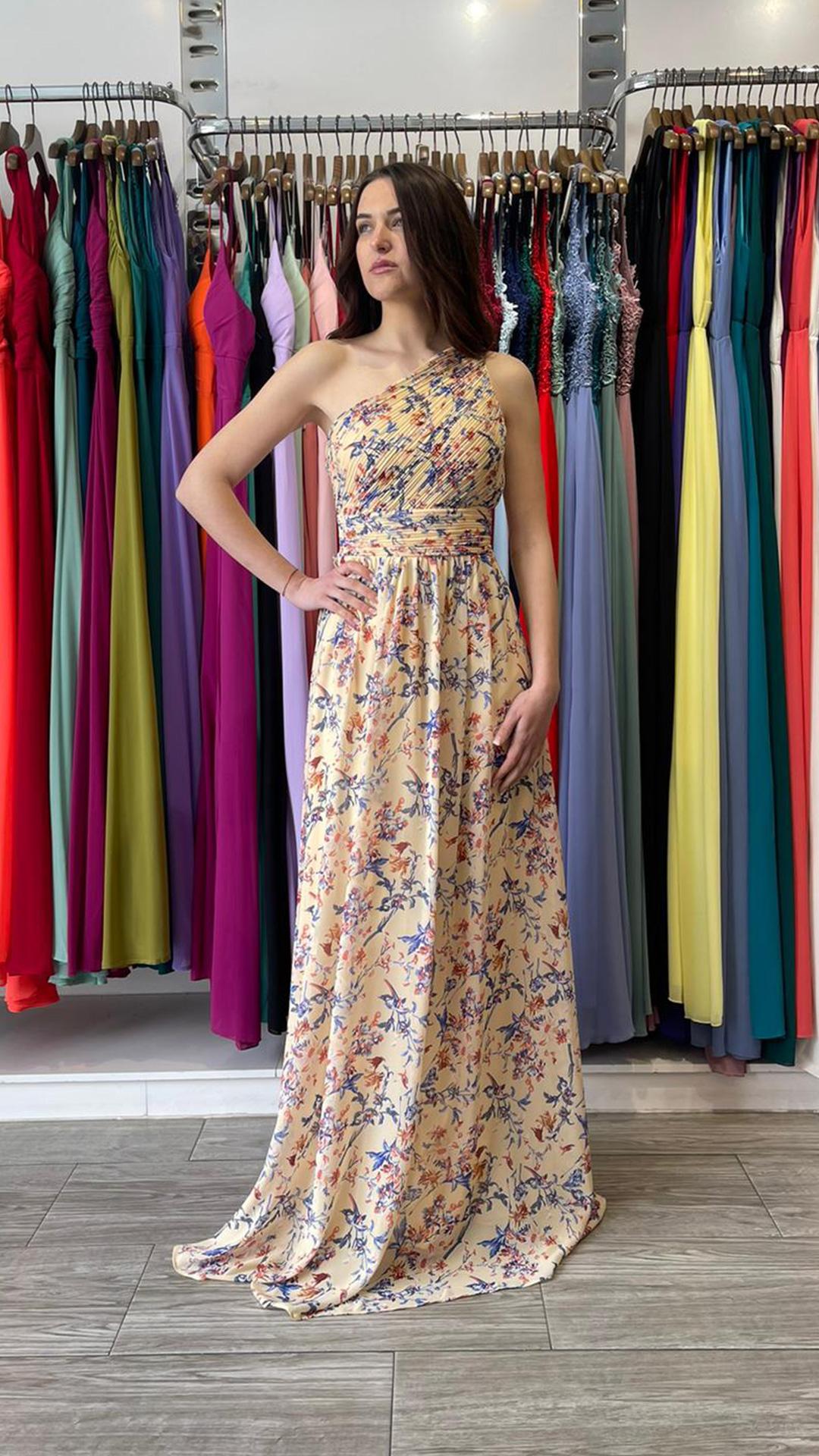 VESTIDO DE UN TIRANTE , DE GASA CON ESTAMPADO DE FLORES.