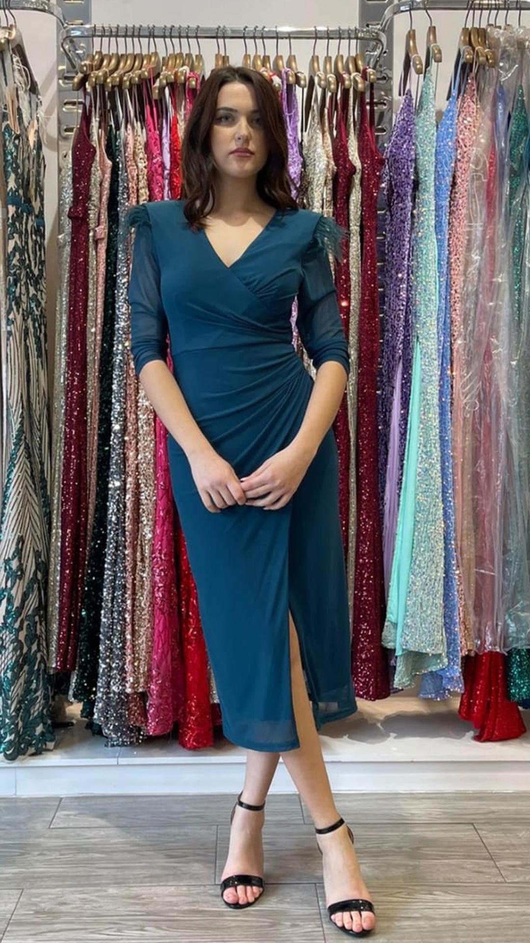 VESTIDO CORTO DE LICRA, CON PLUMAS EN LOS HOMBROS.