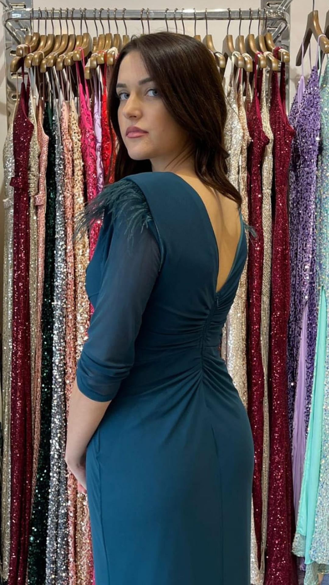 VESTIDO CORTO DE LICRA , CON PLUMAS EN LOS HOMBROS.