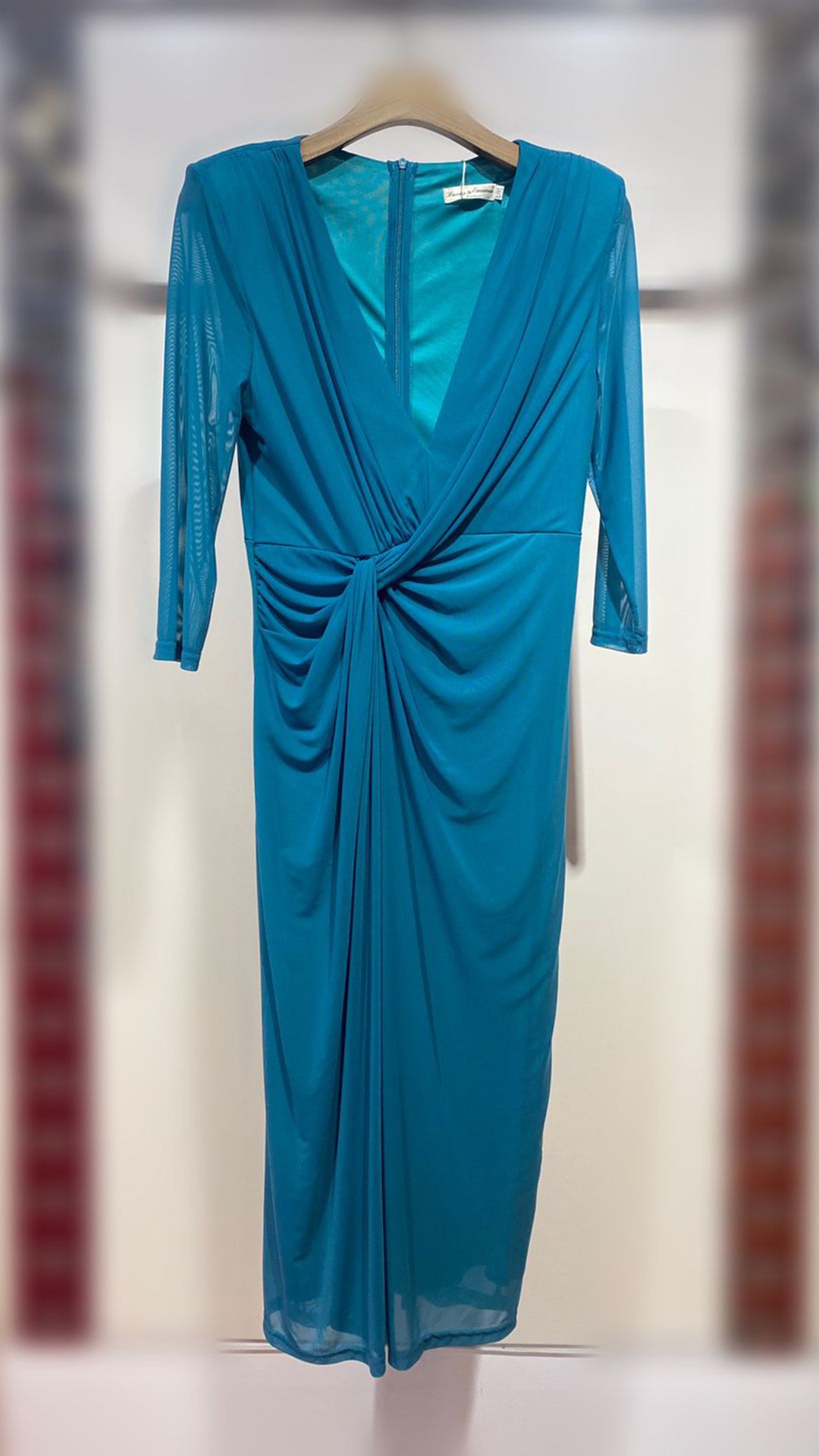 VESTIDO CORTO, CON MANGA TRES CUARTOS TRANSPARENTE.