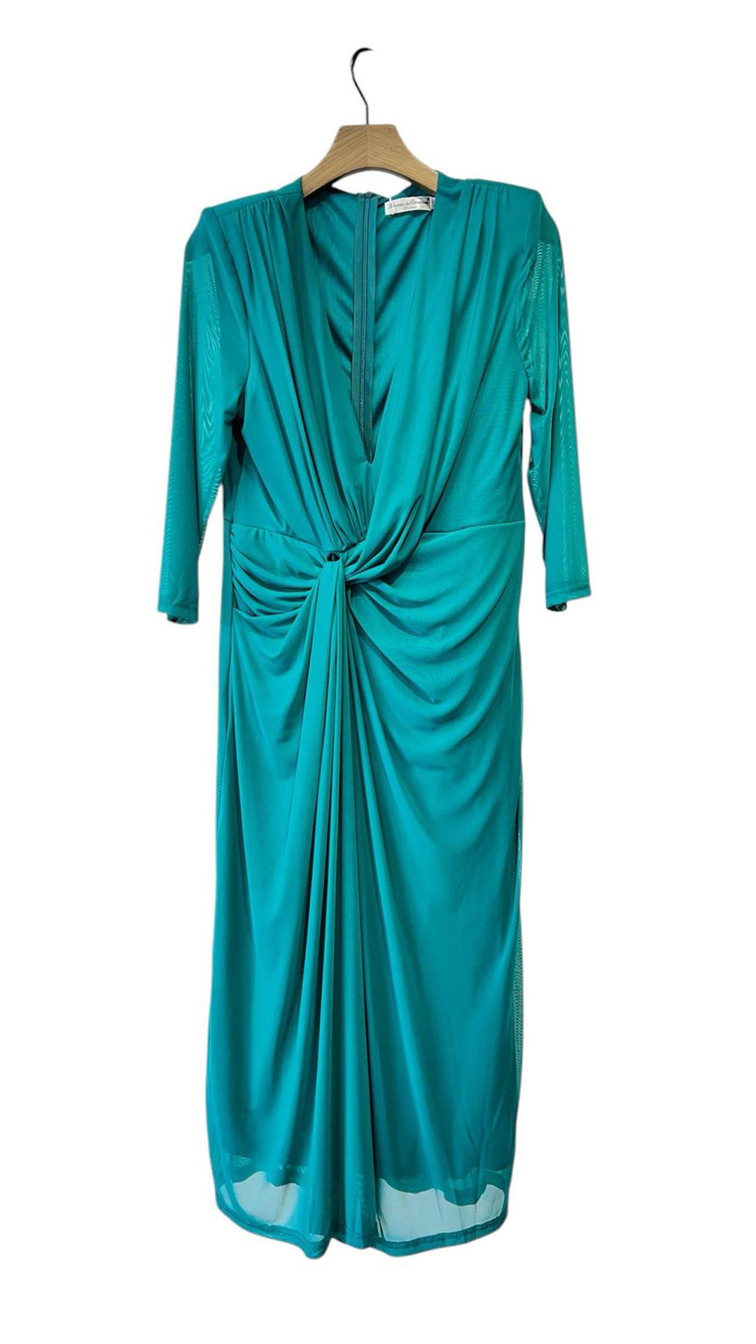 VESTIDO CORTO, CON MANGA TRES CUARTOS TRANSPARENTE.