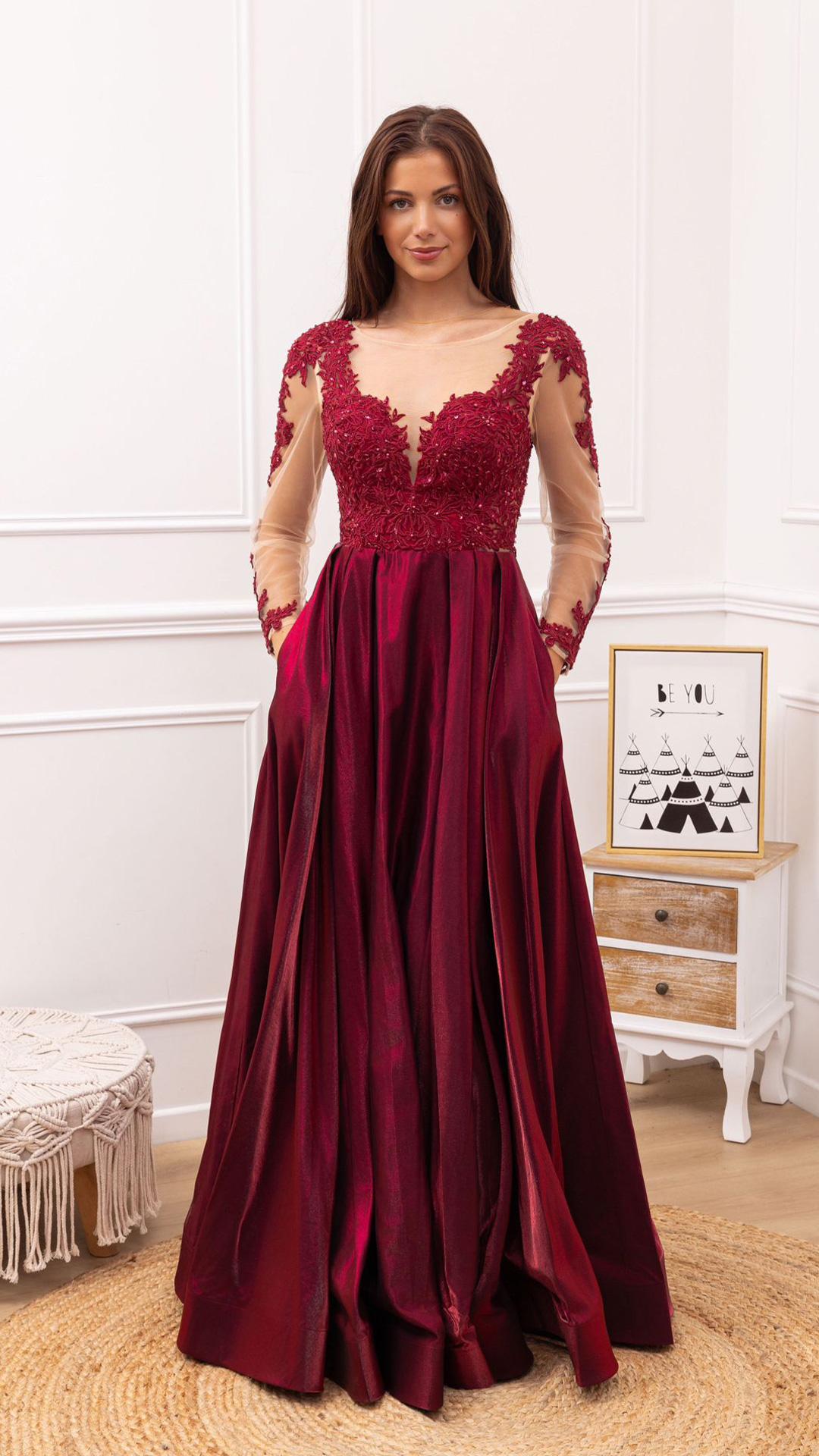 VESTIDO CORTE PRINCESA, CON MANGAS TRASNPARENTES.
