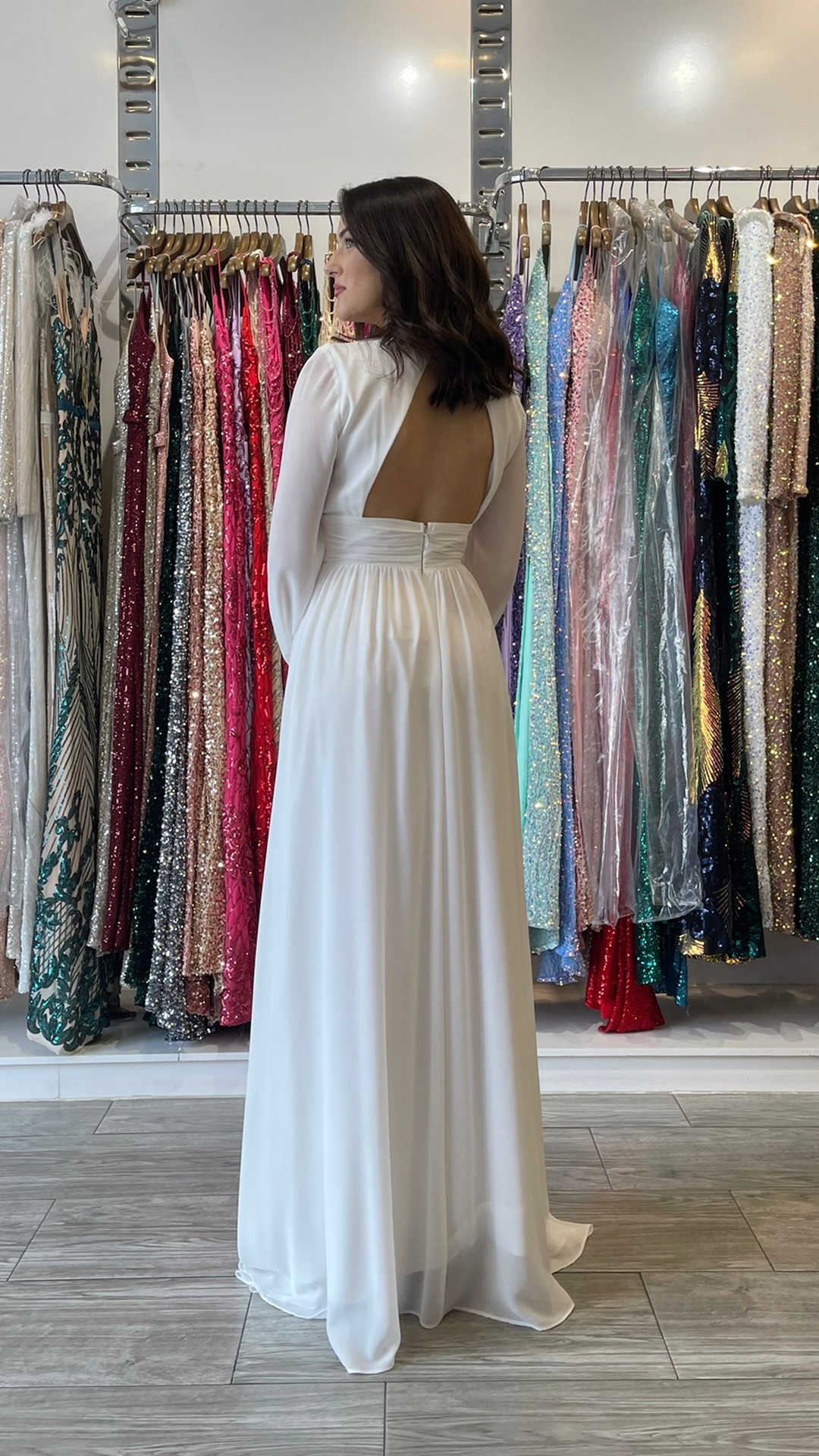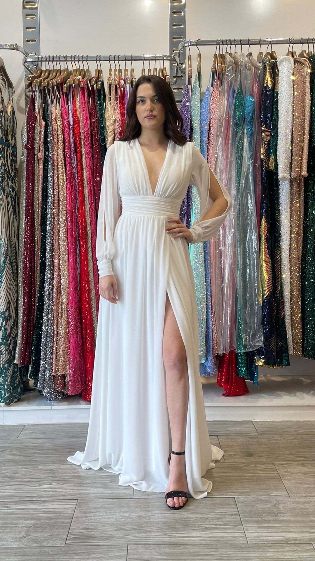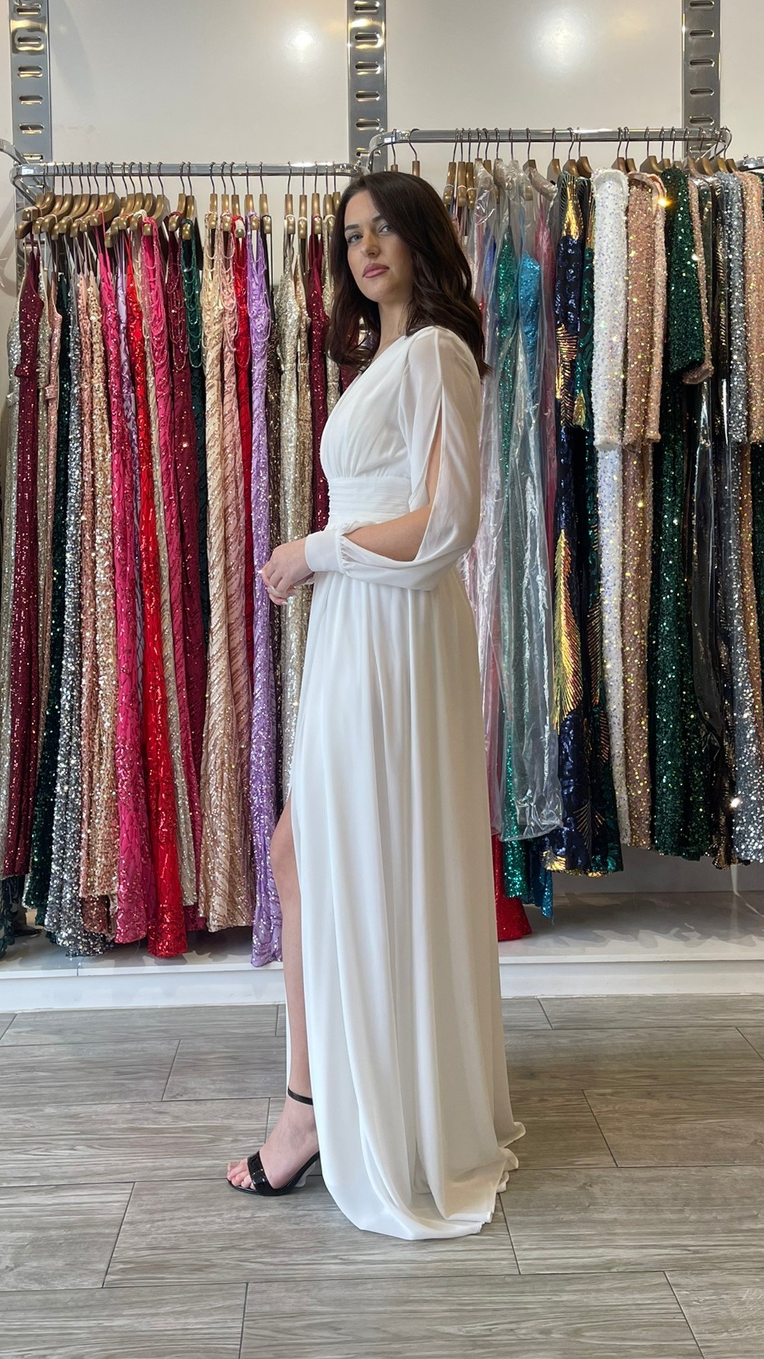 VESTIDO DE GASA LARGO , CON ABERTURAS EN LA MANGA.