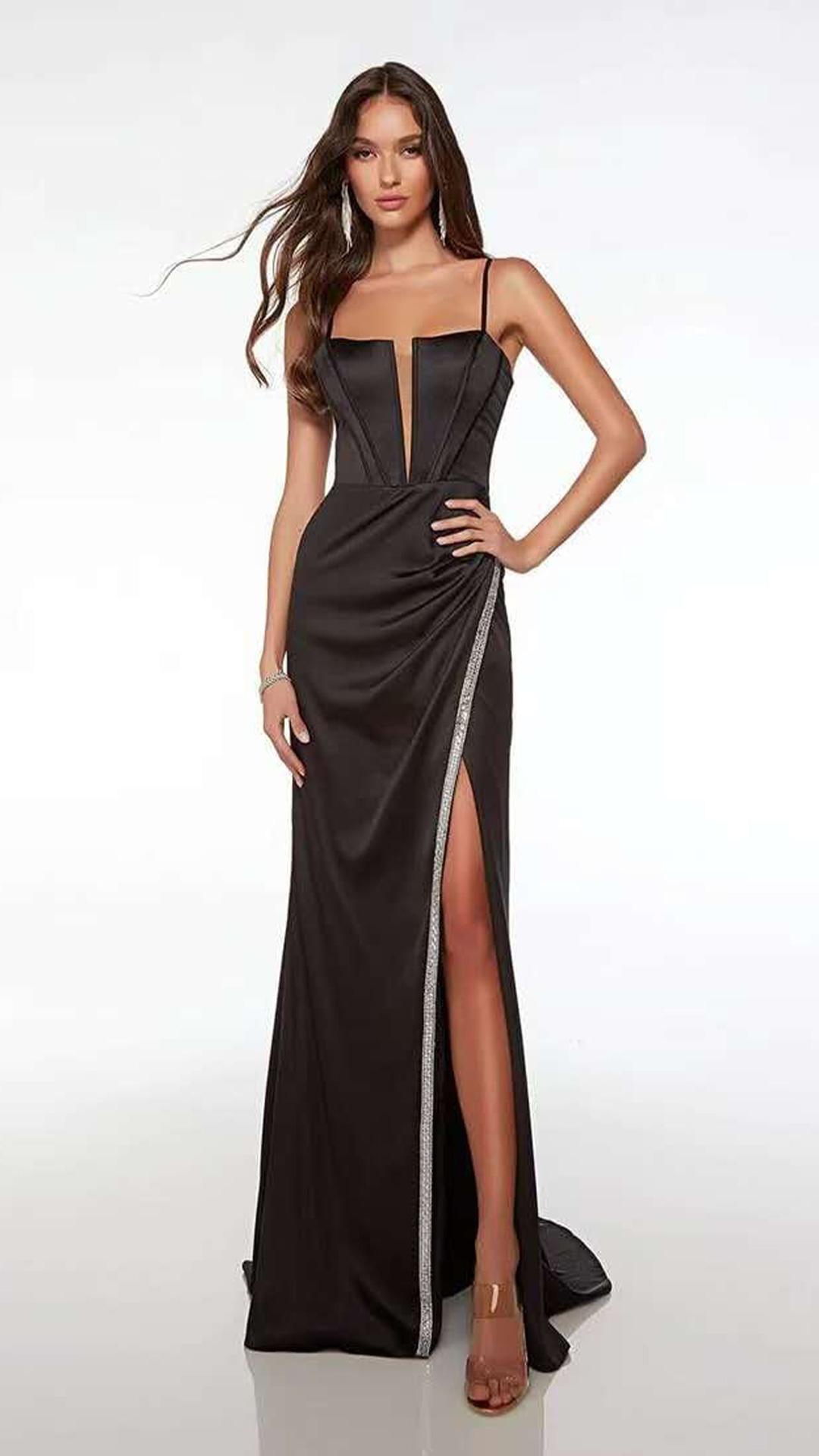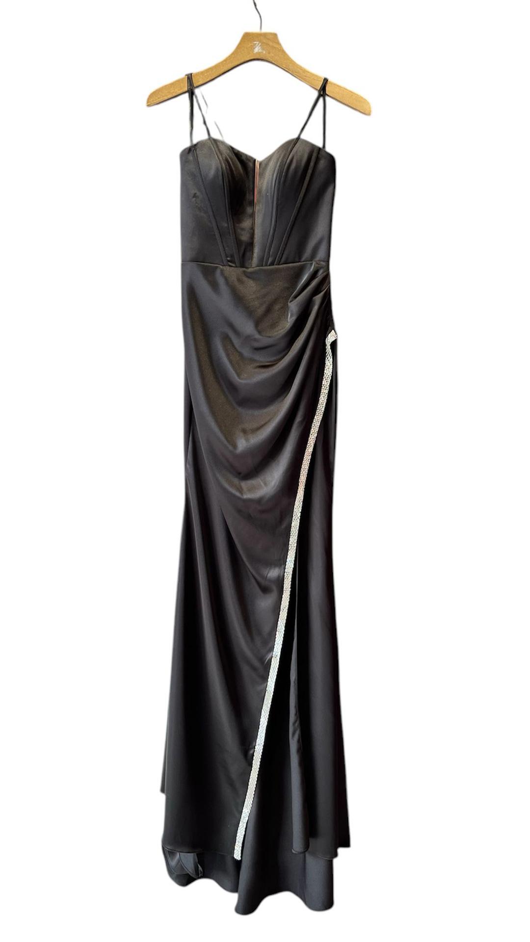 VESTIDO DE SATEN , CORTE SIRENA CON ABERTURA .
