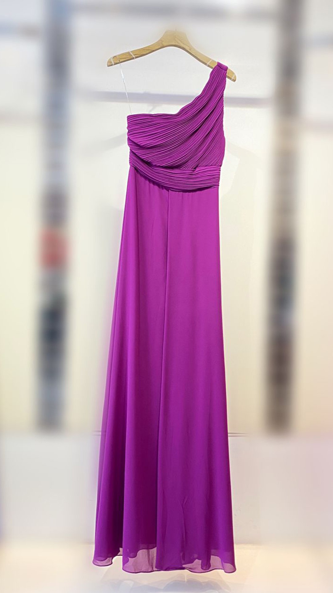 VESTIDO DE GASA CON ABERTURA DE UN TIRANTE.