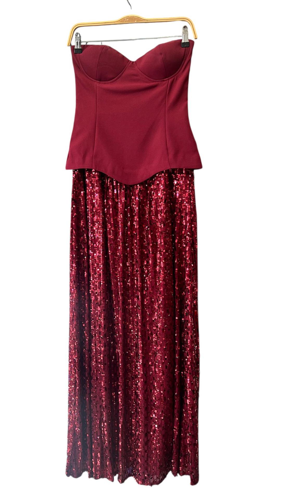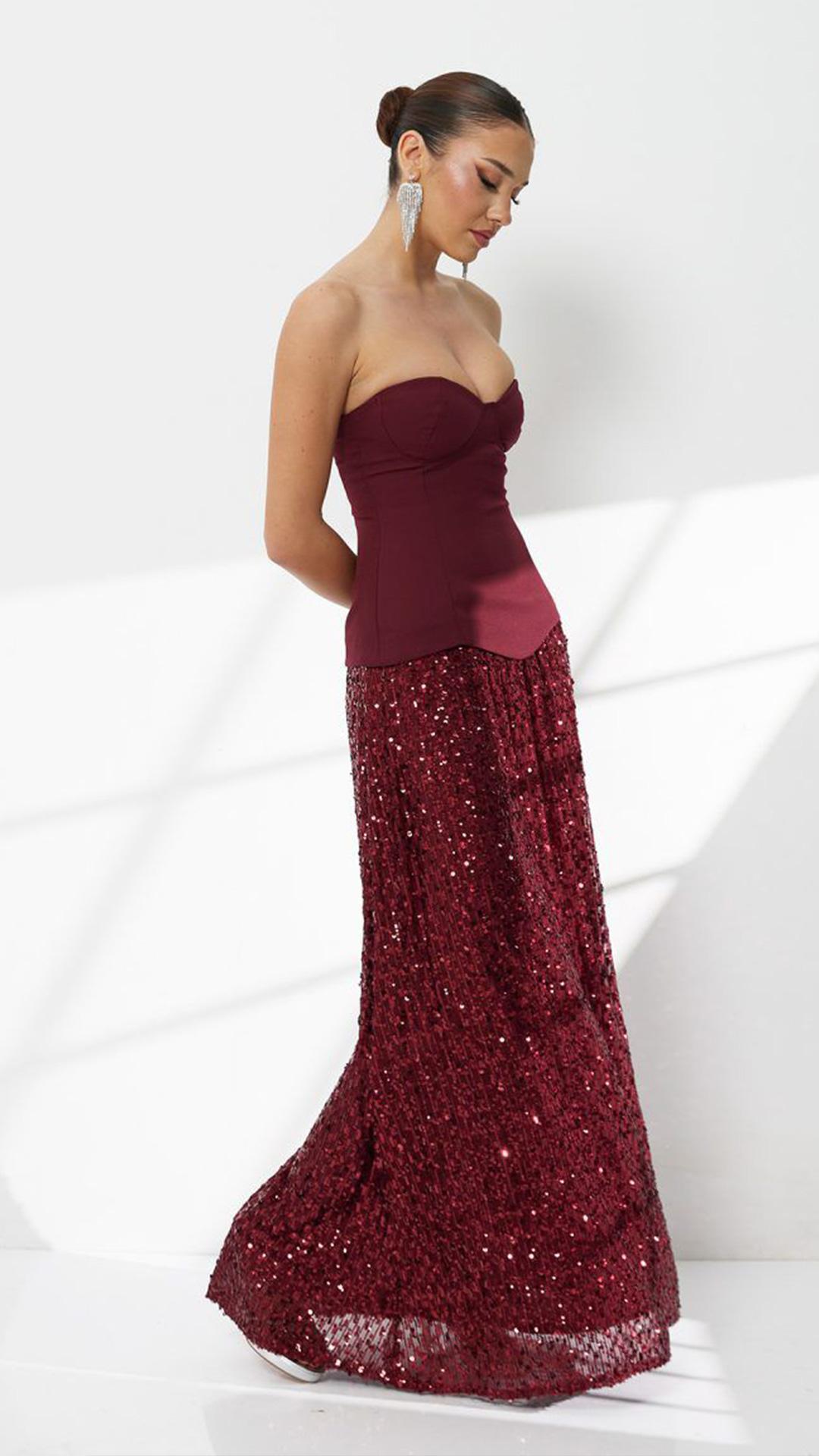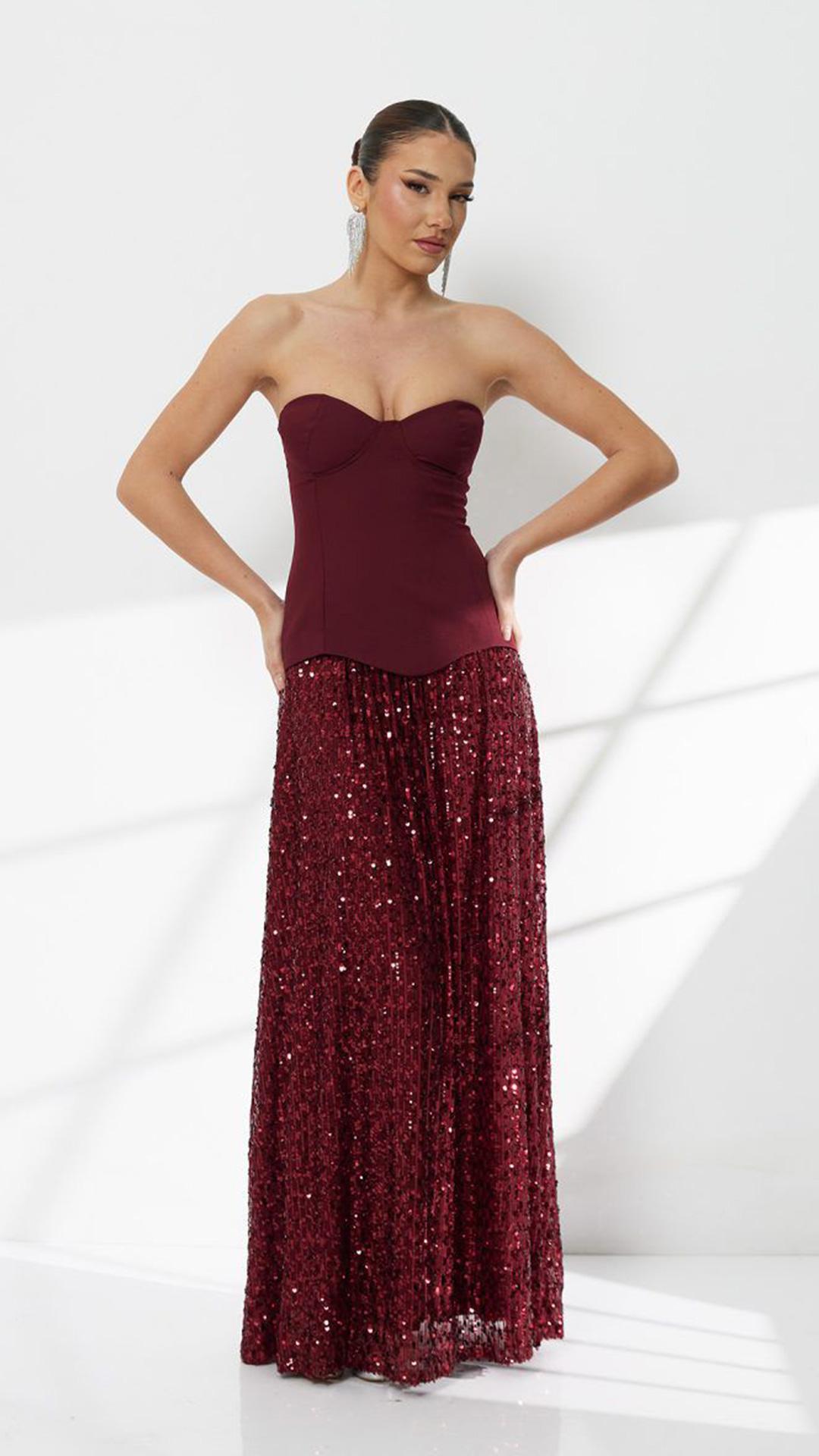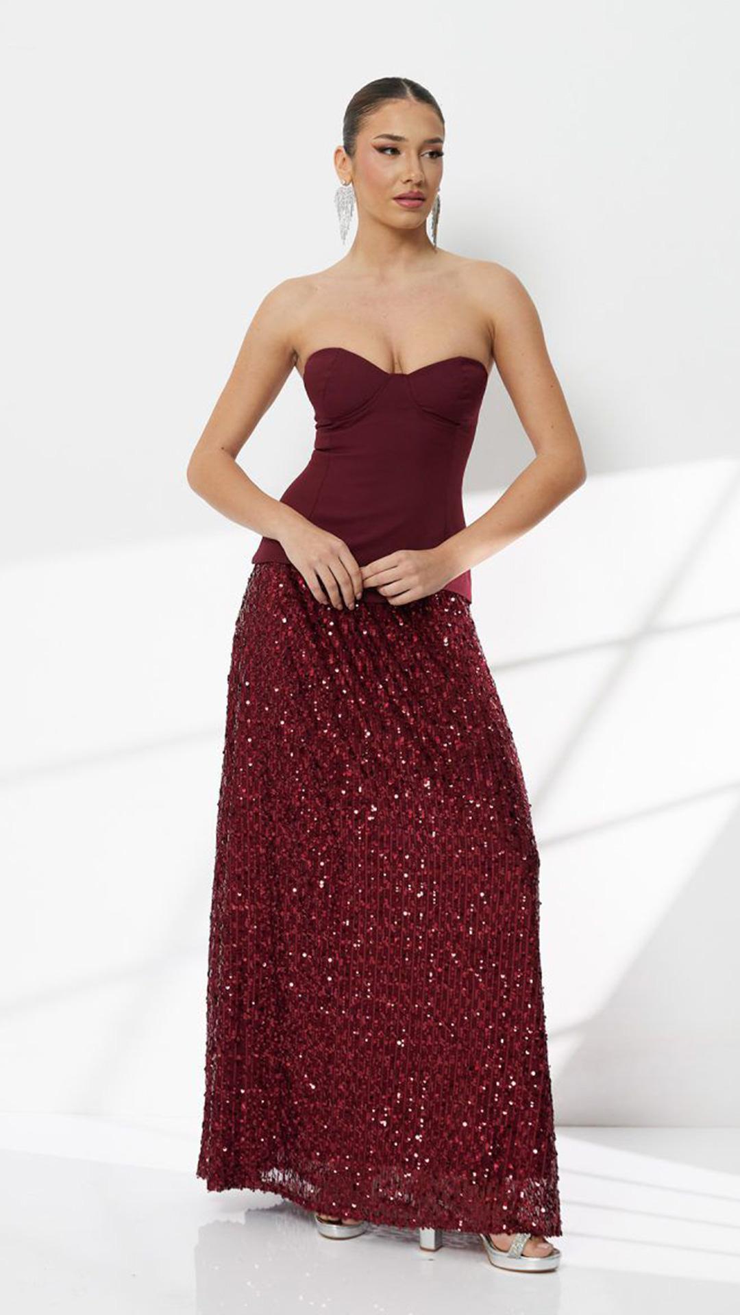 VESTIDO LARGO PALABRA DE HONOR, CON FALDA DE LENTEJUELAS.