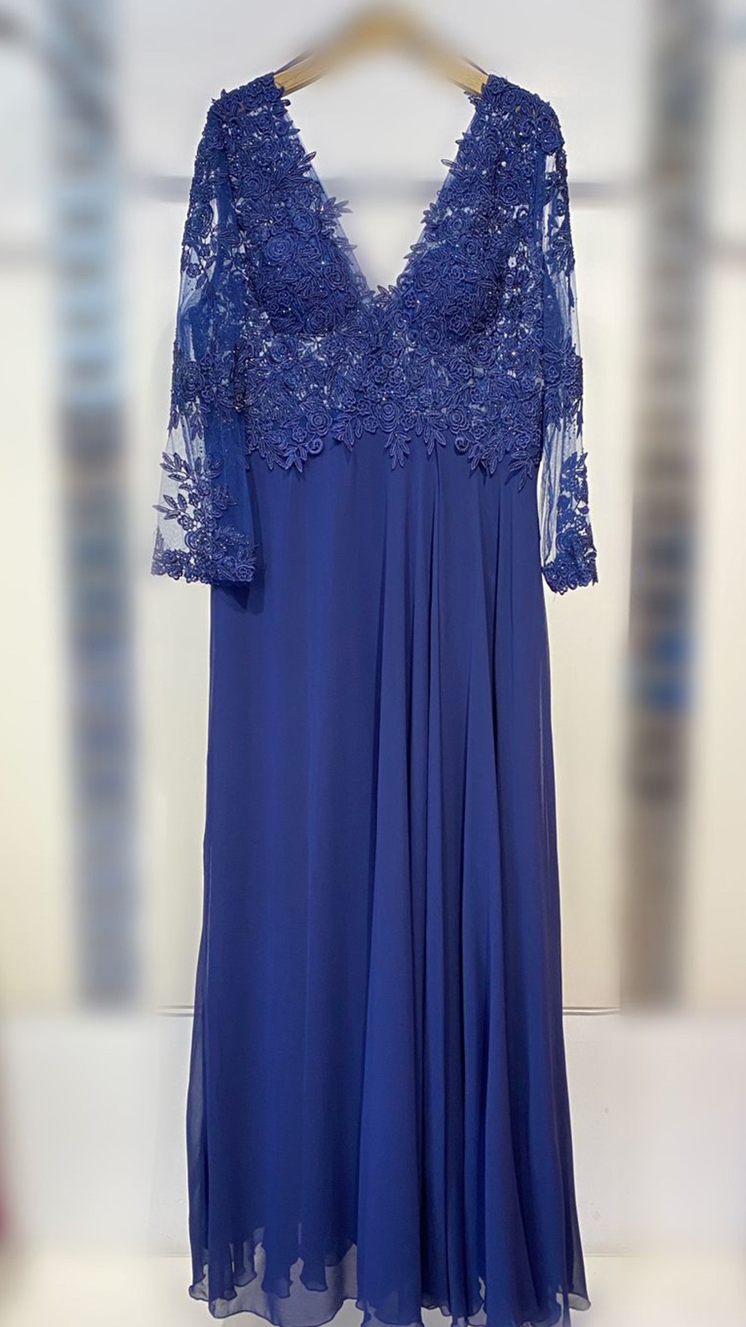 VESTIDO LARGO DE GASA CON ABERTURA EN LA PIERNA, CON MANGA TRES CUARTOS.