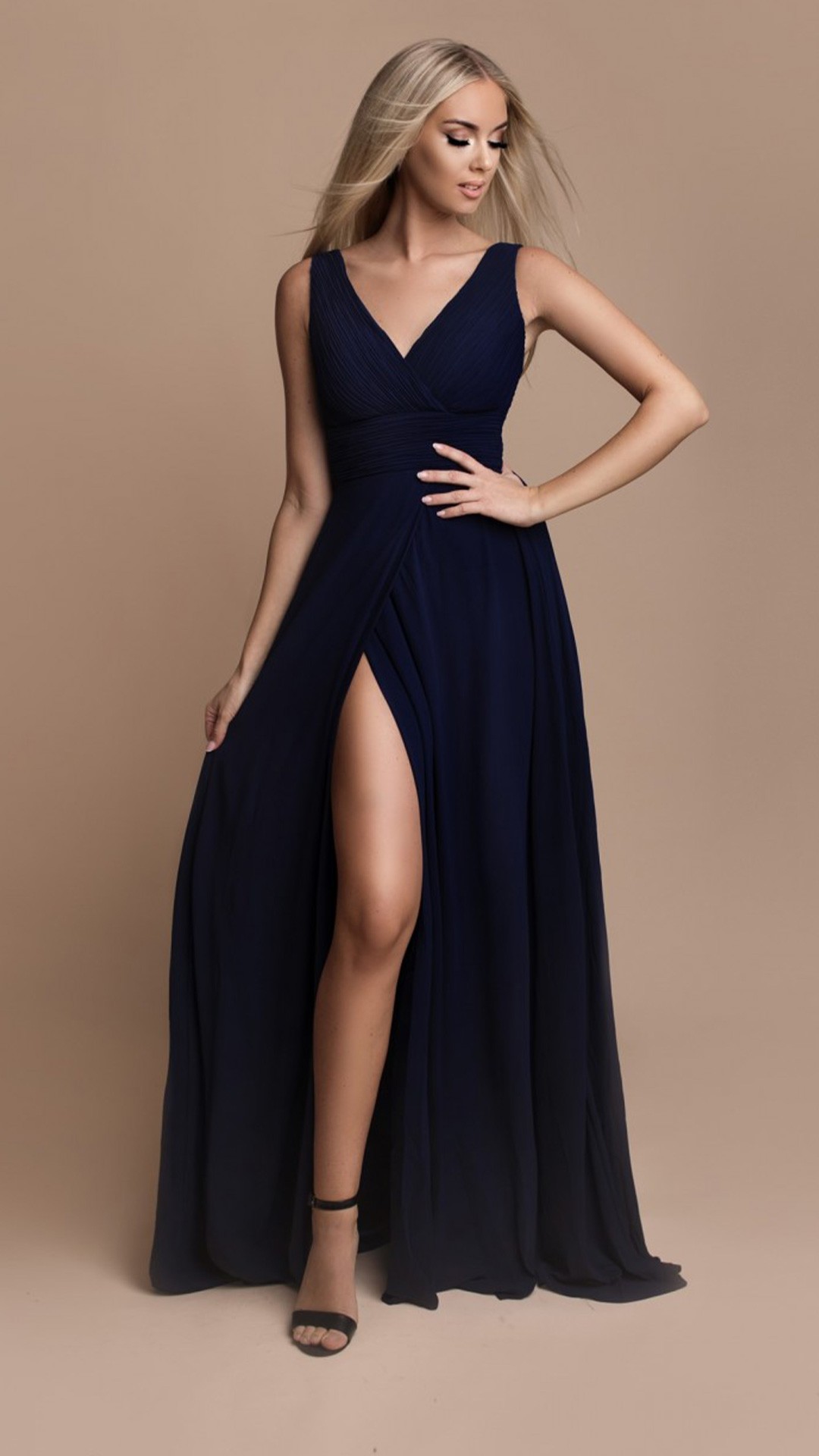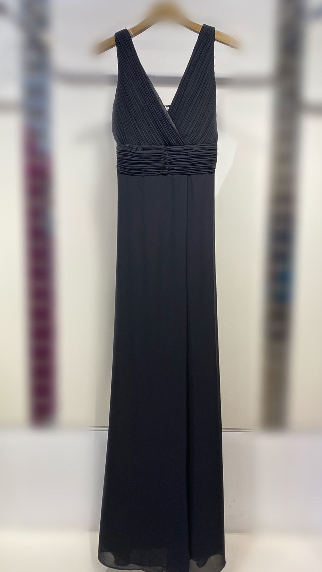 VESTIDO DE GASA, CON ABERTURA, LLEVA GOMA EN LA ESPALDA.