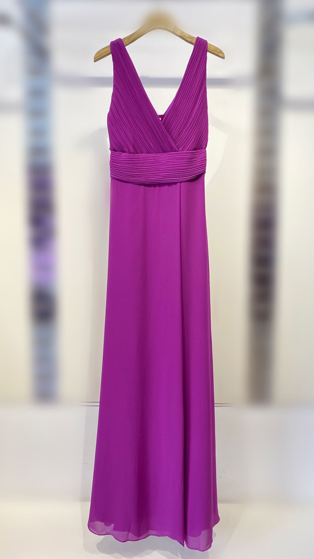 VESTIDO DE GASA, CON ABERTURA, LLEVA GOMA EN LA ESPALDA.