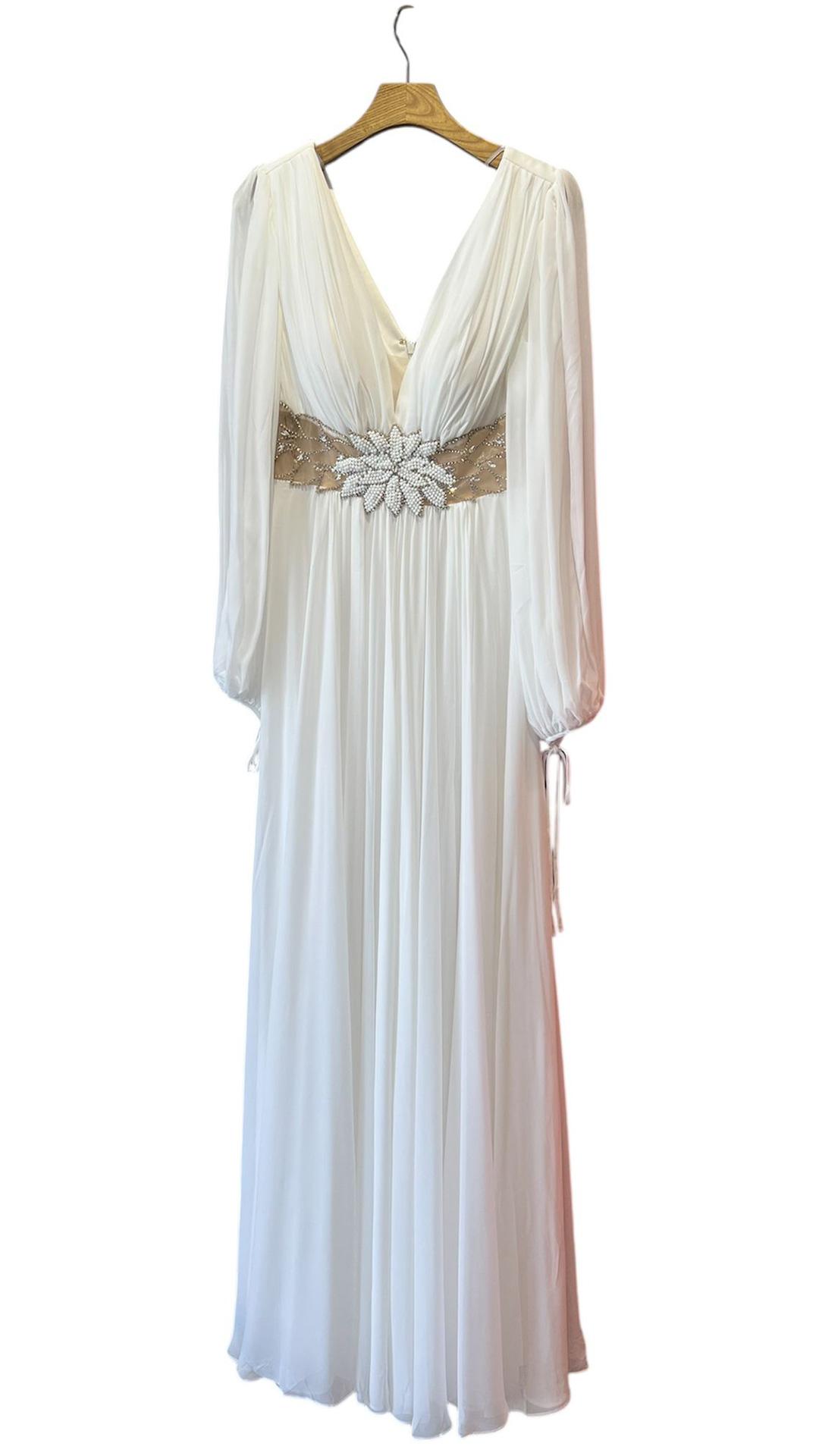 VESTIDO DE GASA, CON ABERTURA Y CINTURILLA DE PIEDRAS EN FORMA DE FLOR.