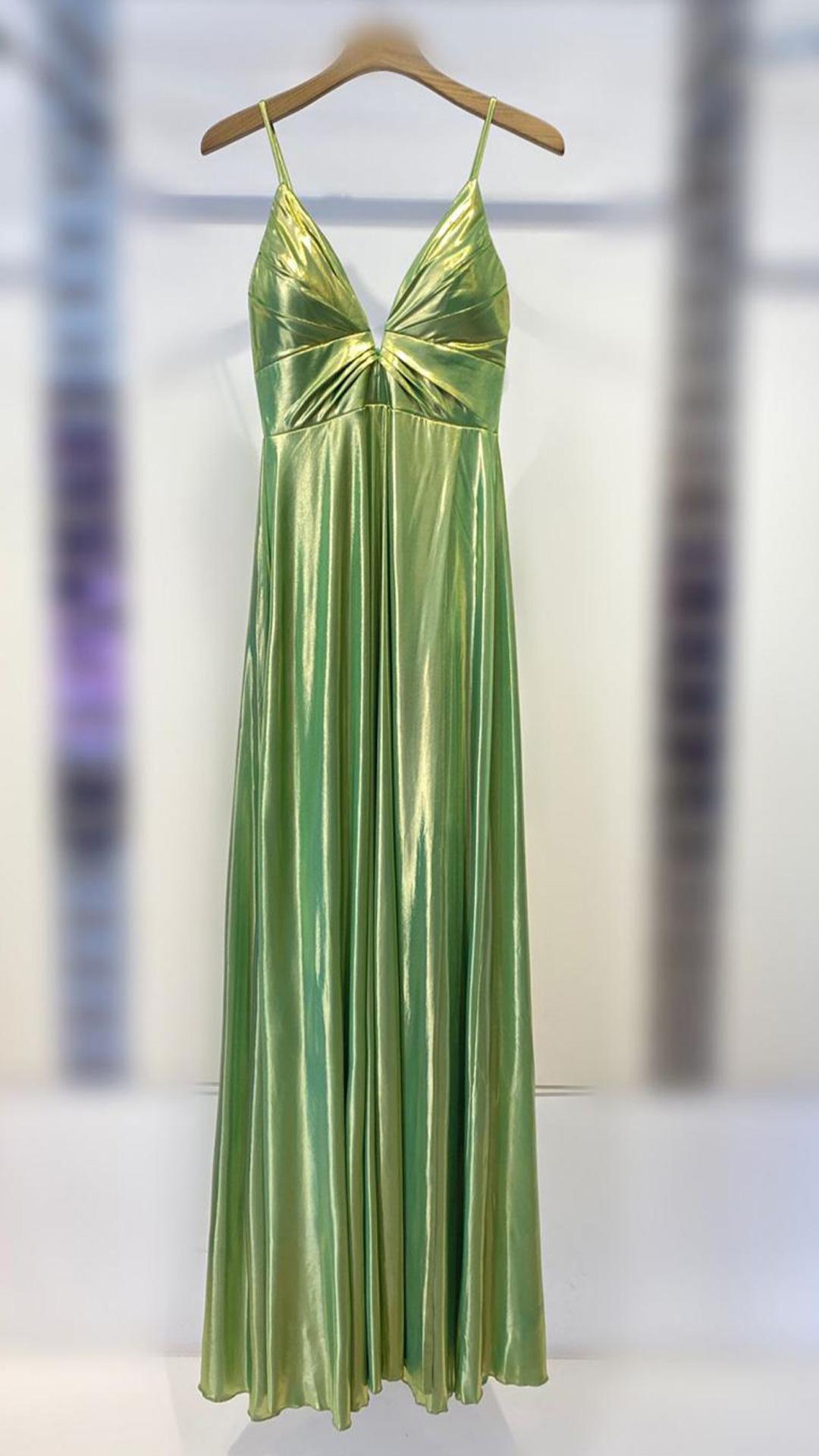 VESTIDO DE TELA METALIZADA , ESCOTE V CON TIRANTE FINO