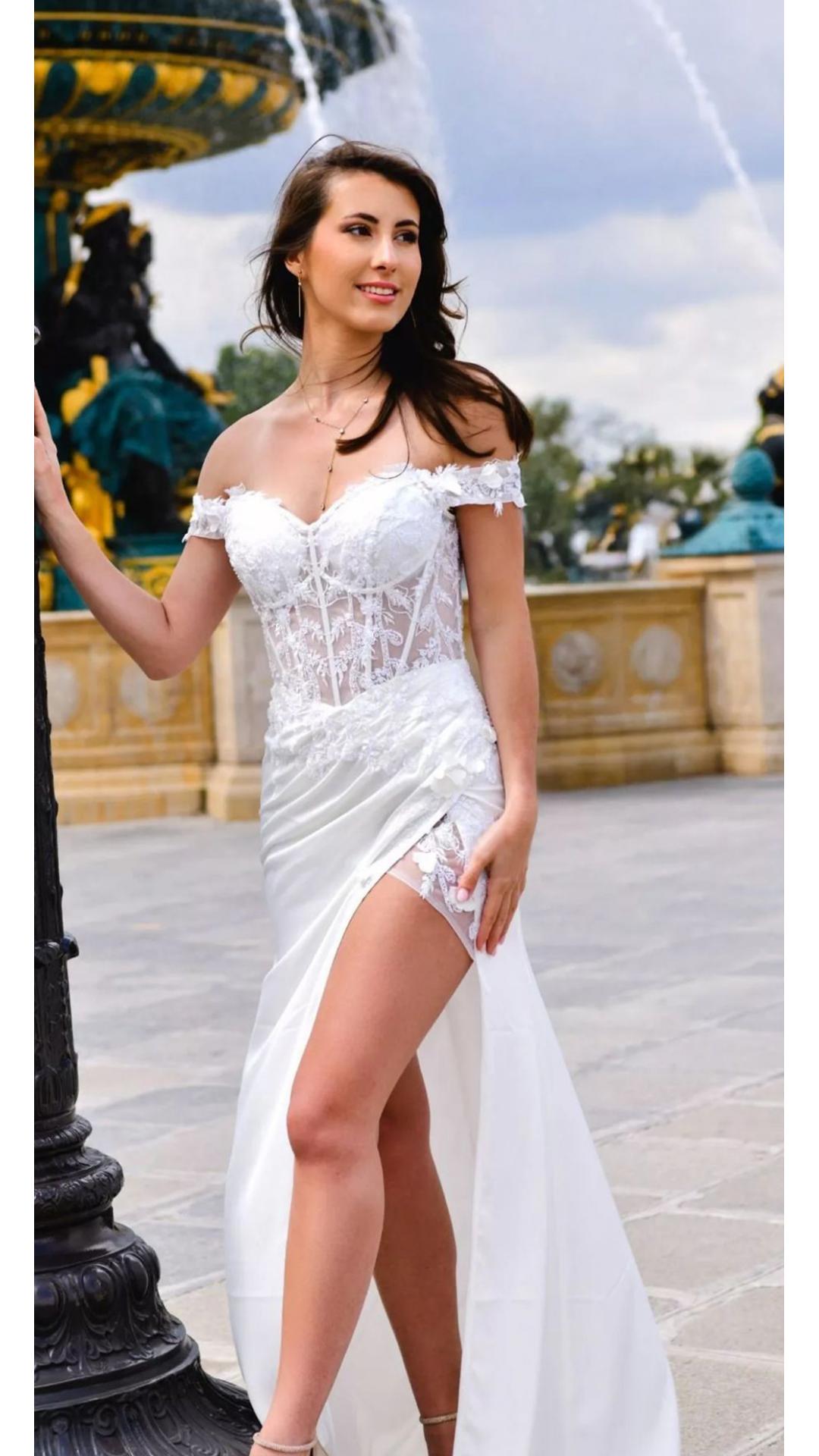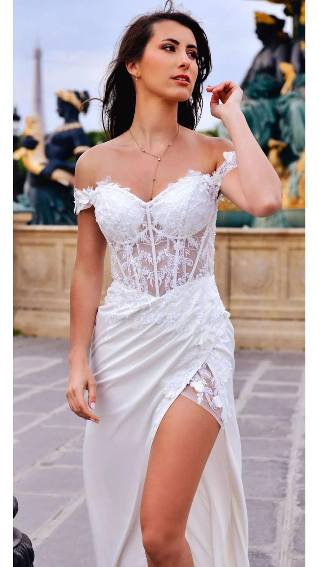 VESTIDO CORTE SIRENA , DE CORSET CON BRILLOS.