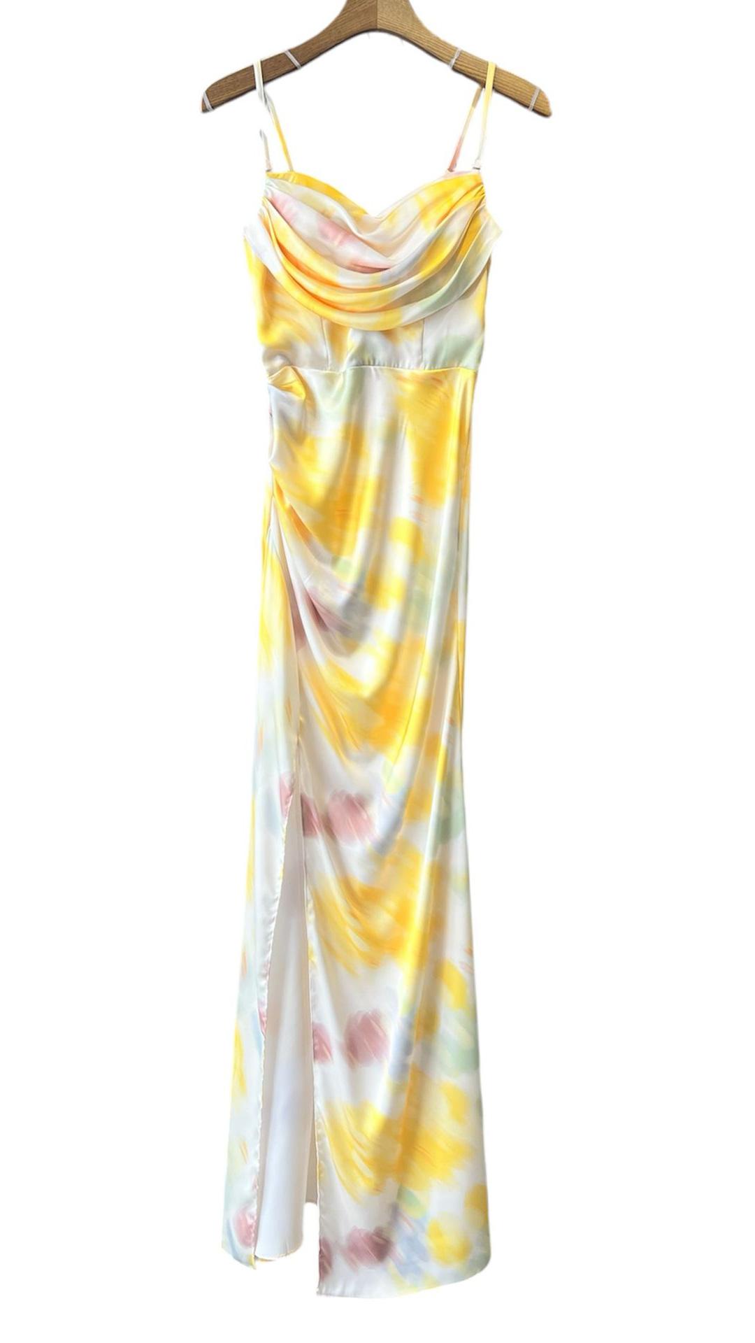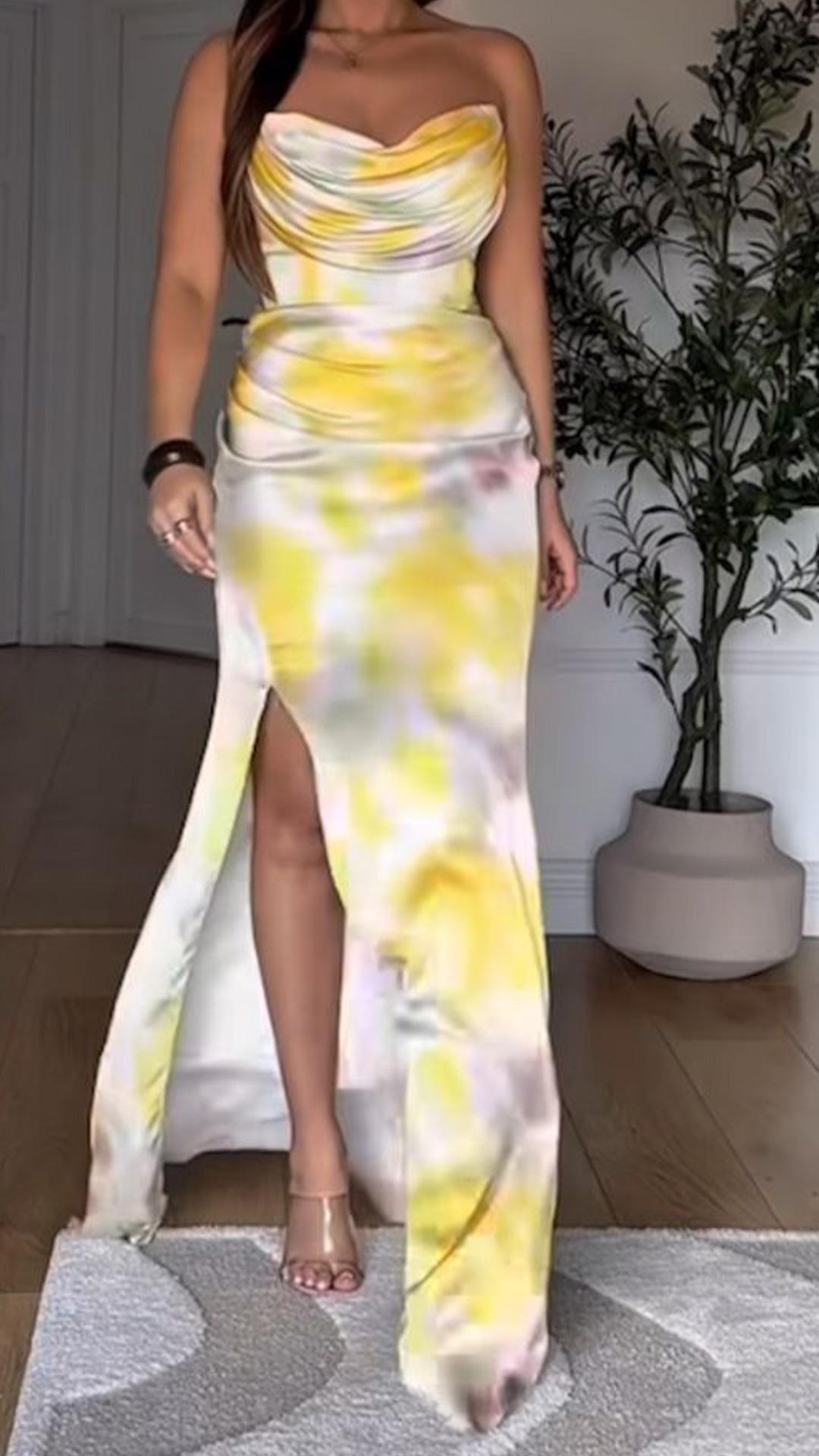 VESTIDO CORTE SIRENA DE SATEN ESTAMPADO FLORAL.