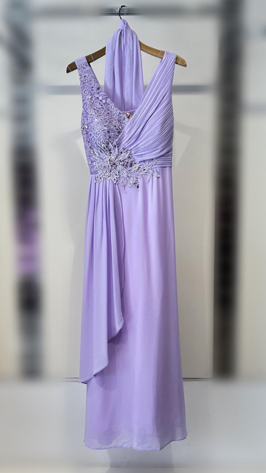 VESTIDO TALLA GRANDE DE GASA, CON PIEDRAS EN LA PARTE SUPERIOR.